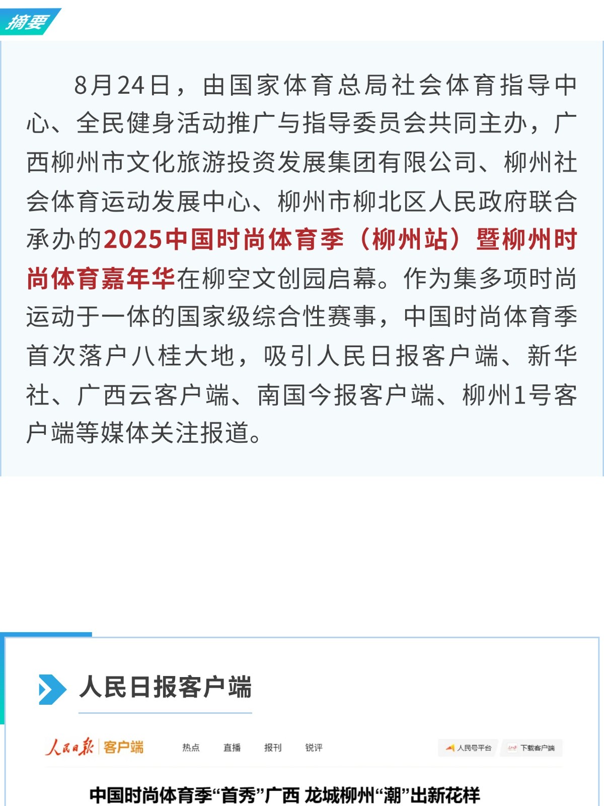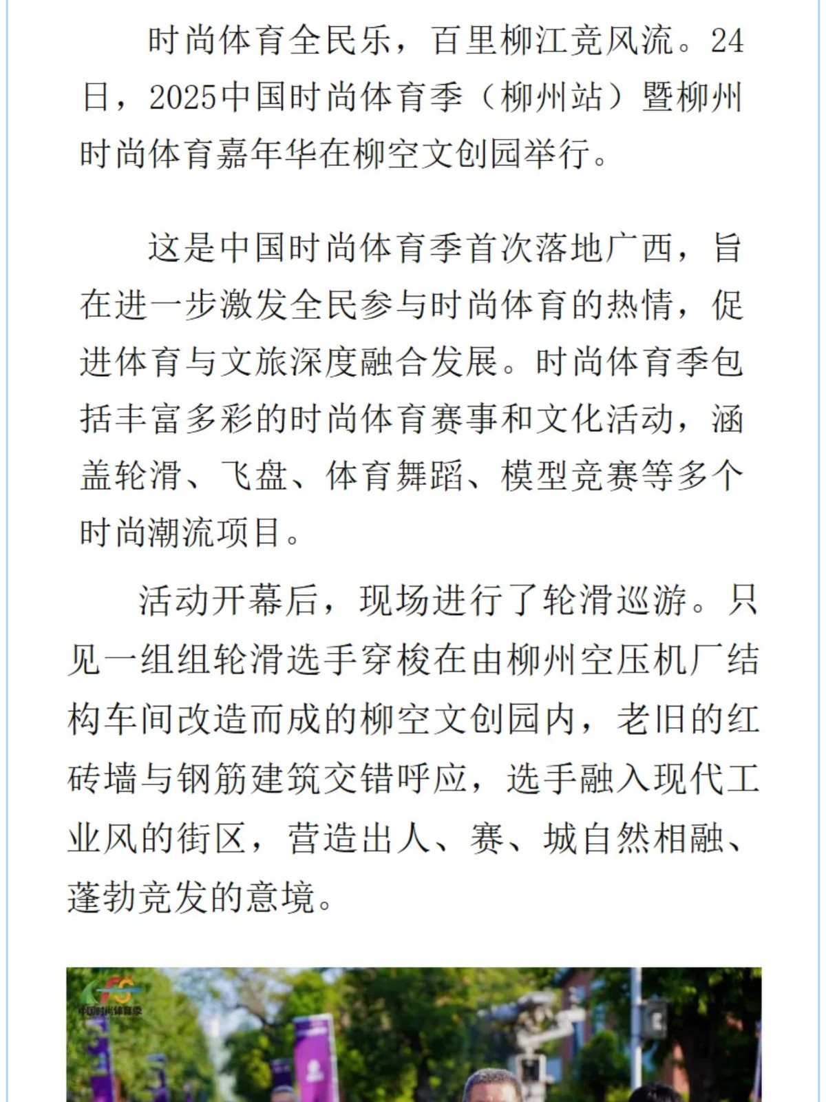 多家媒體關(guān)注:2025中國時(shí)尚體育季(柳州站)在柳空文創(chuàng)園啟動(dòng) 發(fā)布時(shí)間:2025年08月29日 17時(shí)來源:本站原創(chuàng)瀏覽:363 人次