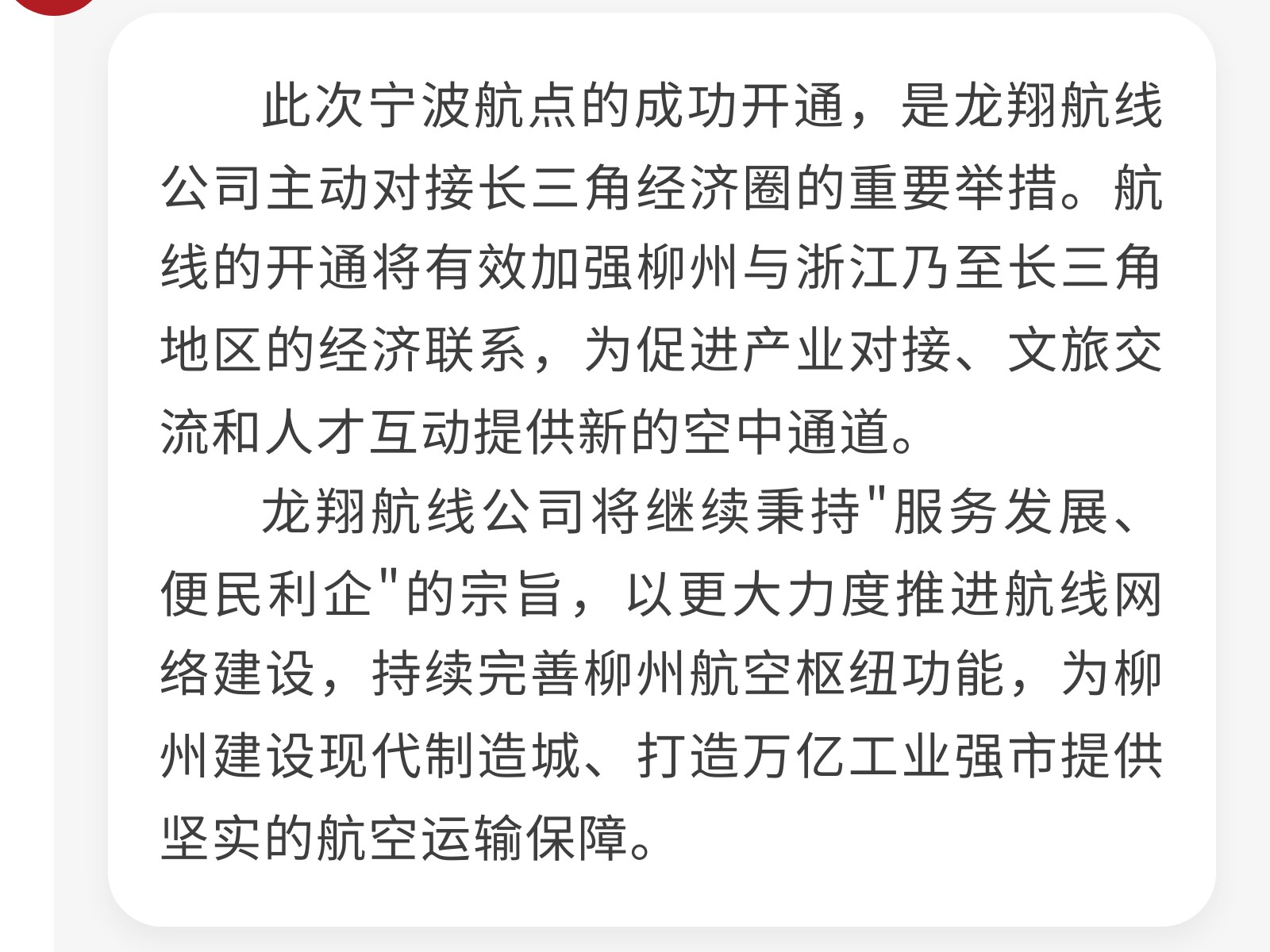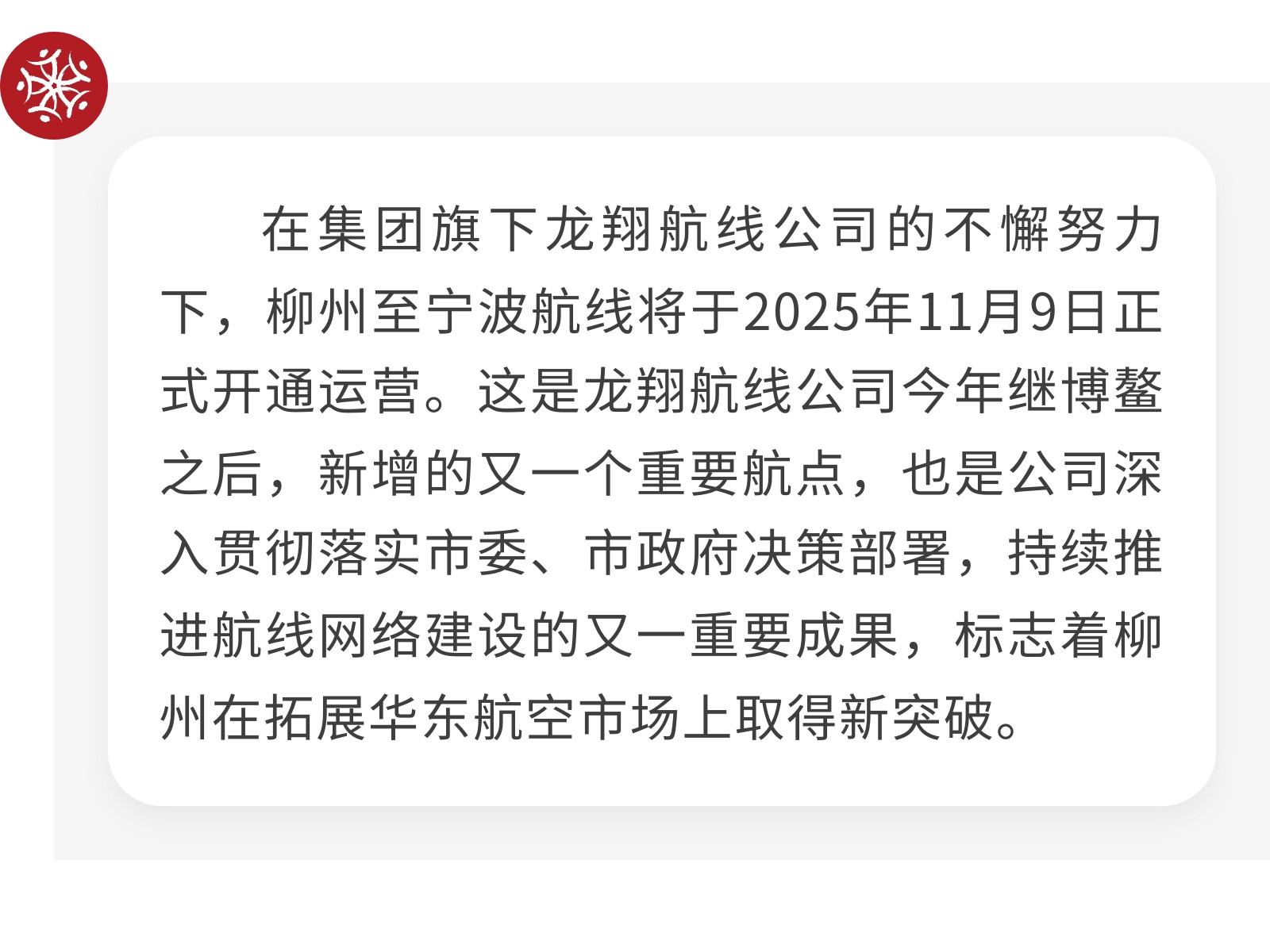 航線布局再突破!集團旗下龍翔航線公司成功開通寧波新航點 發(fā)布時間:2025年11月12日 11時來源:本站原創(chuàng)瀏覽:128 人次