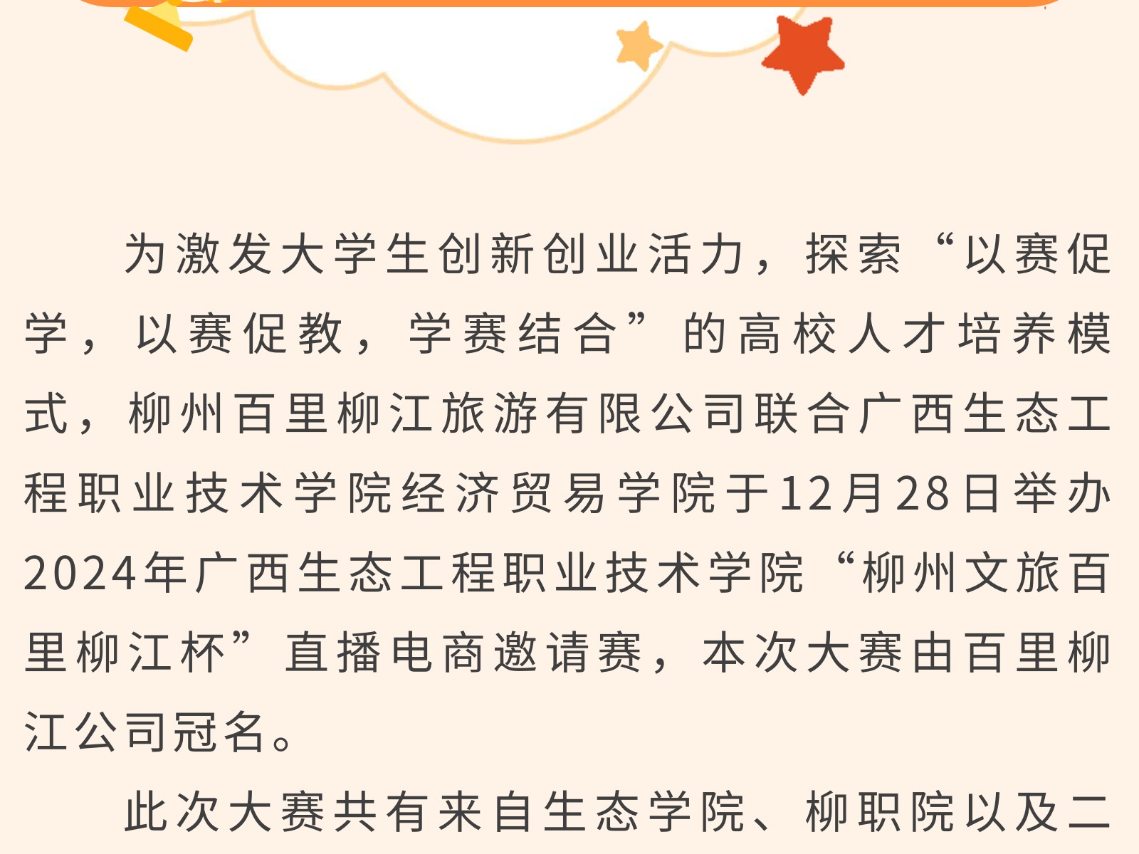 高校聯(lián)合競(jìng)賽,共筑電商夢(mèng)想?——2024年廣西生態(tài)工程職業(yè)技術(shù)學(xué)院柳州文旅“百里柳江杯”直播電商邀請(qǐng)賽圓滿落幕 發(fā)布時(shí)間:2025年01月02日 18時(shí)來源:本站原創(chuàng)瀏覽:240 人次