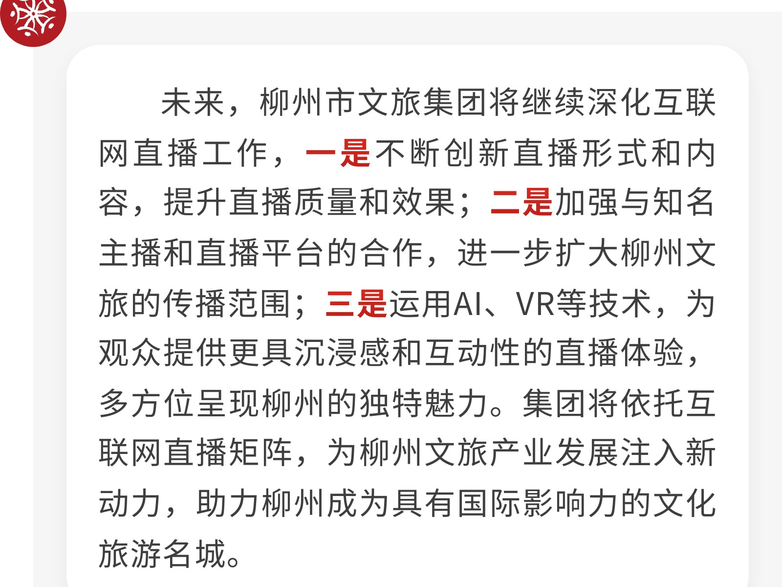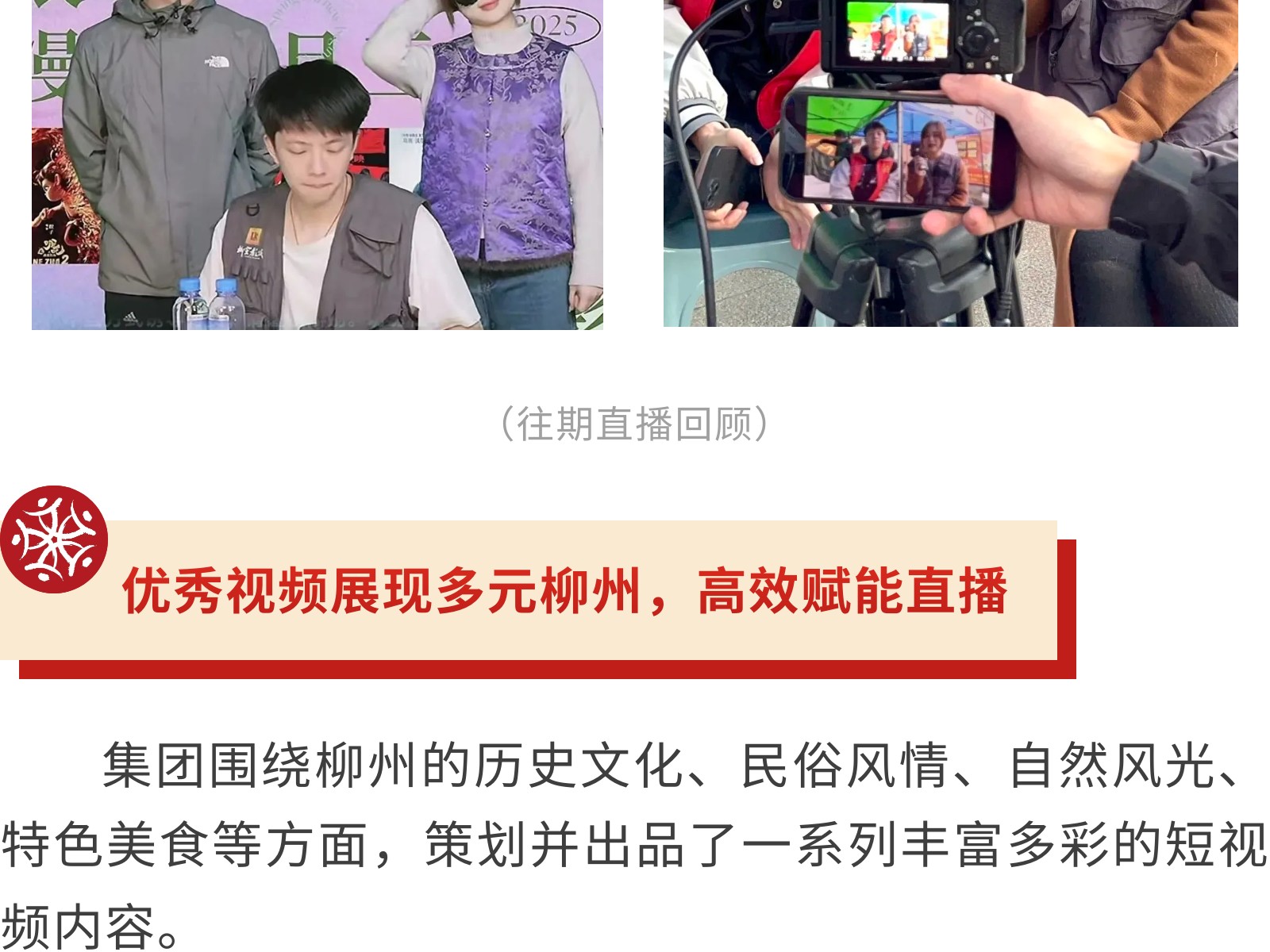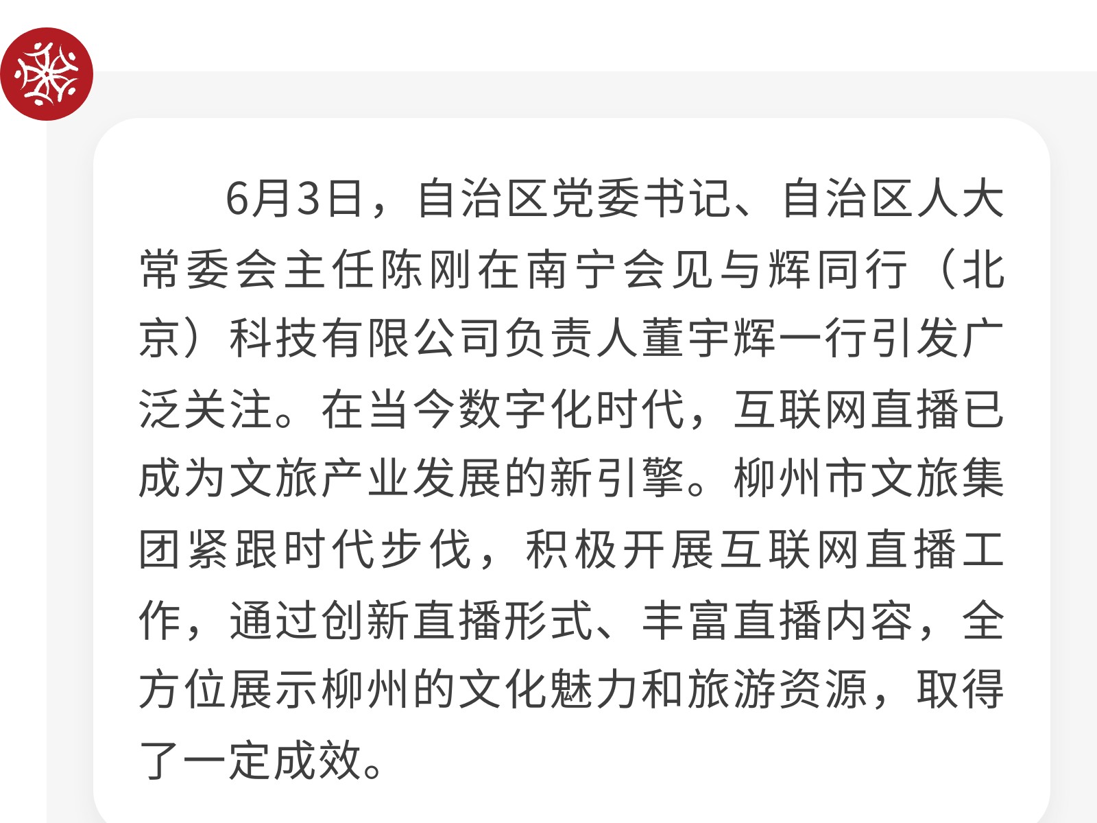 柳州市文旅集團(tuán)積極探索互聯(lián)網(wǎng)直播矩陣,助力城市文旅新發(fā)展 發(fā)布時(shí)間:2025年06月12日 20時(shí)來(lái)源:本站原創(chuàng)瀏覽:185 人次
