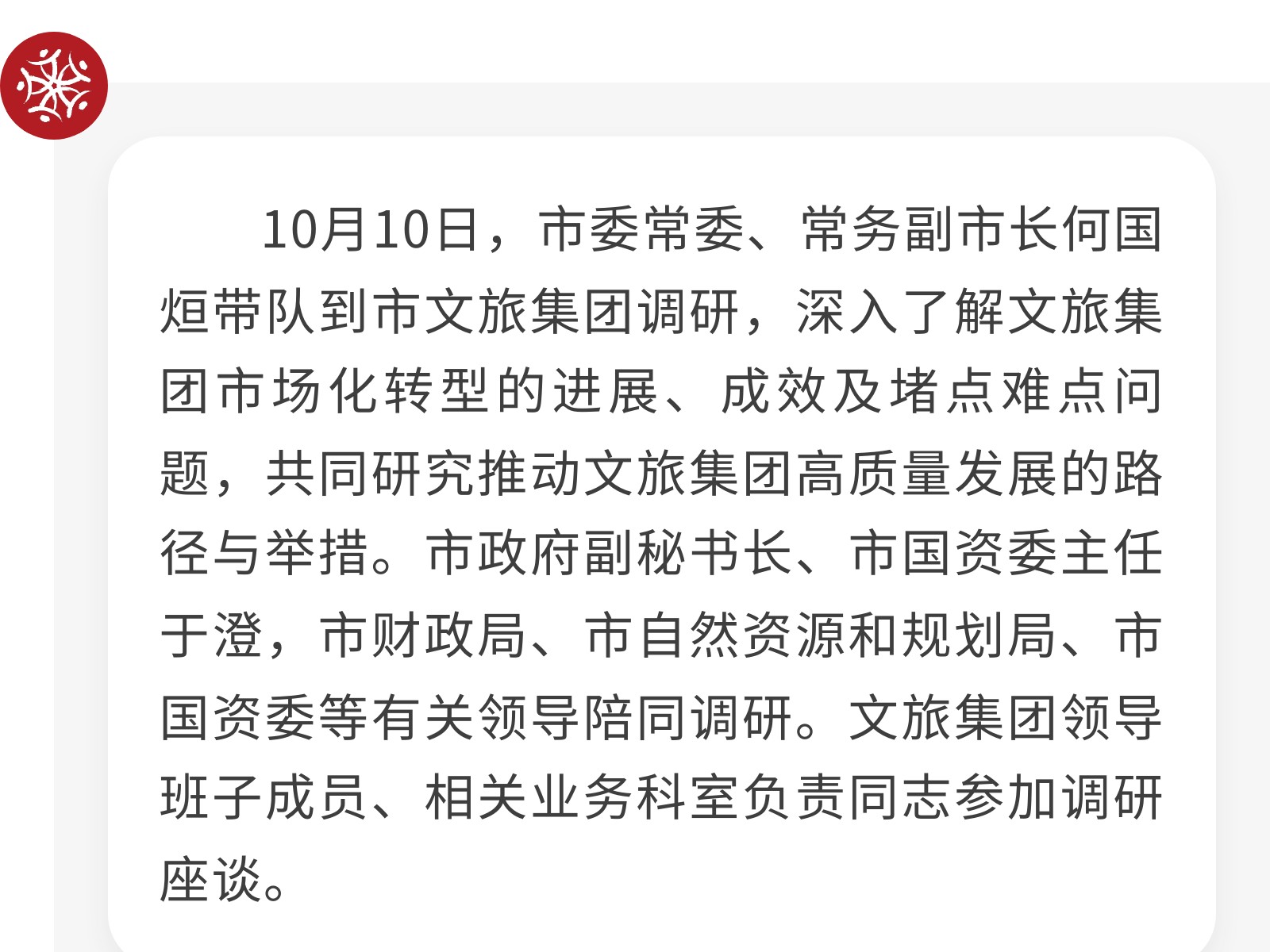 市委常委、常務(wù)副市長(zhǎng)何國(guó)烜到市文旅集團(tuán)調(diào)研 發(fā)布時(shí)間:2025年10月11日 15時(shí)來源:本站原創(chuàng)瀏覽:143 人次