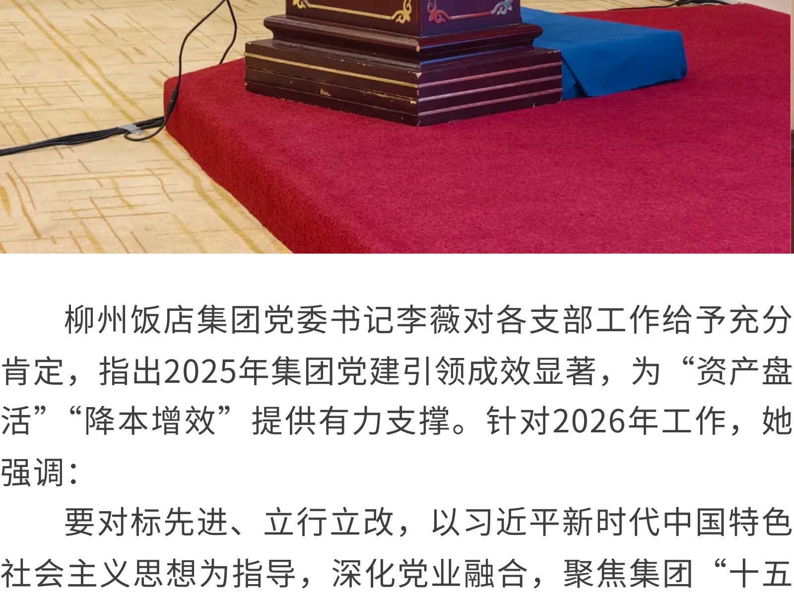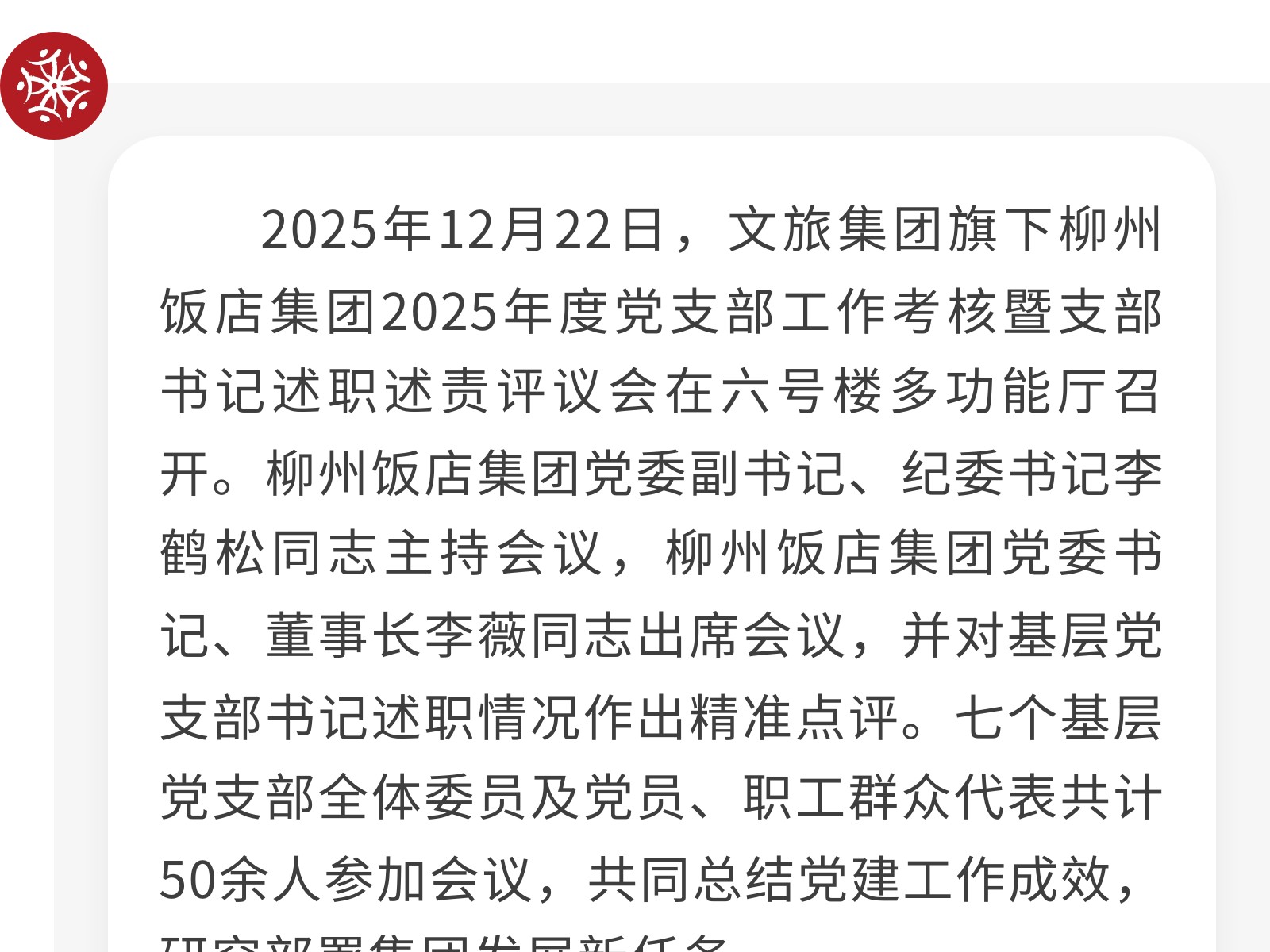 黨建引領(lǐng)聚合力 砥礪奮進譜新篇——柳州飯店集團2025年度黨支部工作考核暨支部書記述職述責評議會圓滿召開 發(fā)布時間:2025年12月30日 11時來源:本站原創(chuàng)瀏覽:111 人次