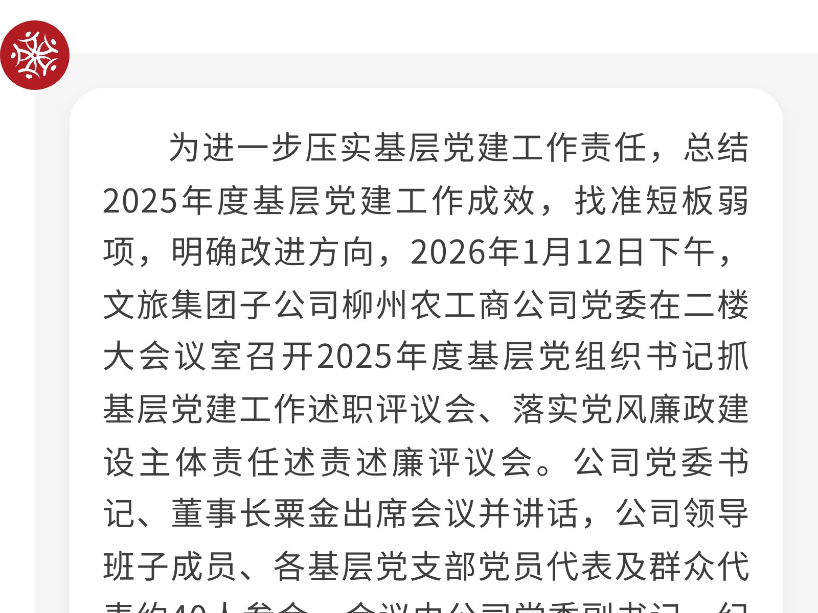 以述促干明方向,以評提質(zhì)啟新程——柳州農(nóng)工商公司黨委召開2025年度基層黨組織書記述職評議會 發(fā)布時間:2026年01月14日 14時來源:本站原創(chuàng)瀏覽:26 人次