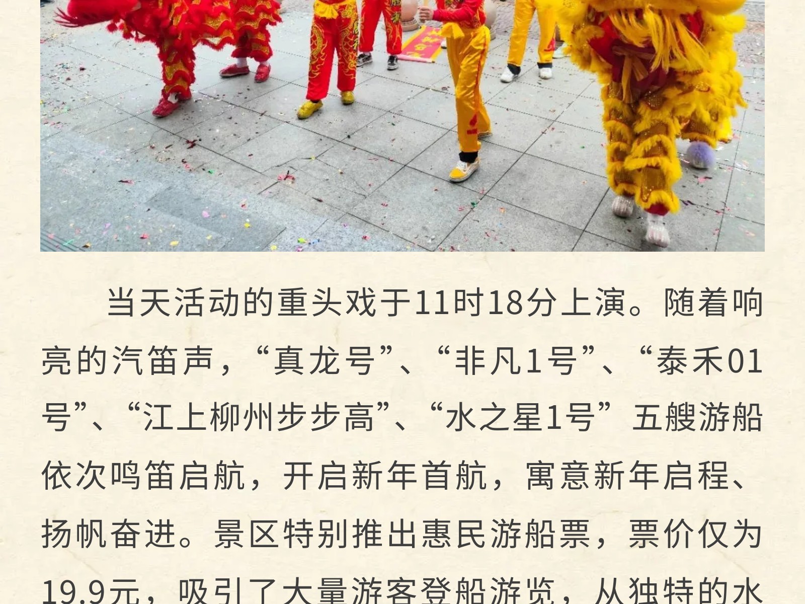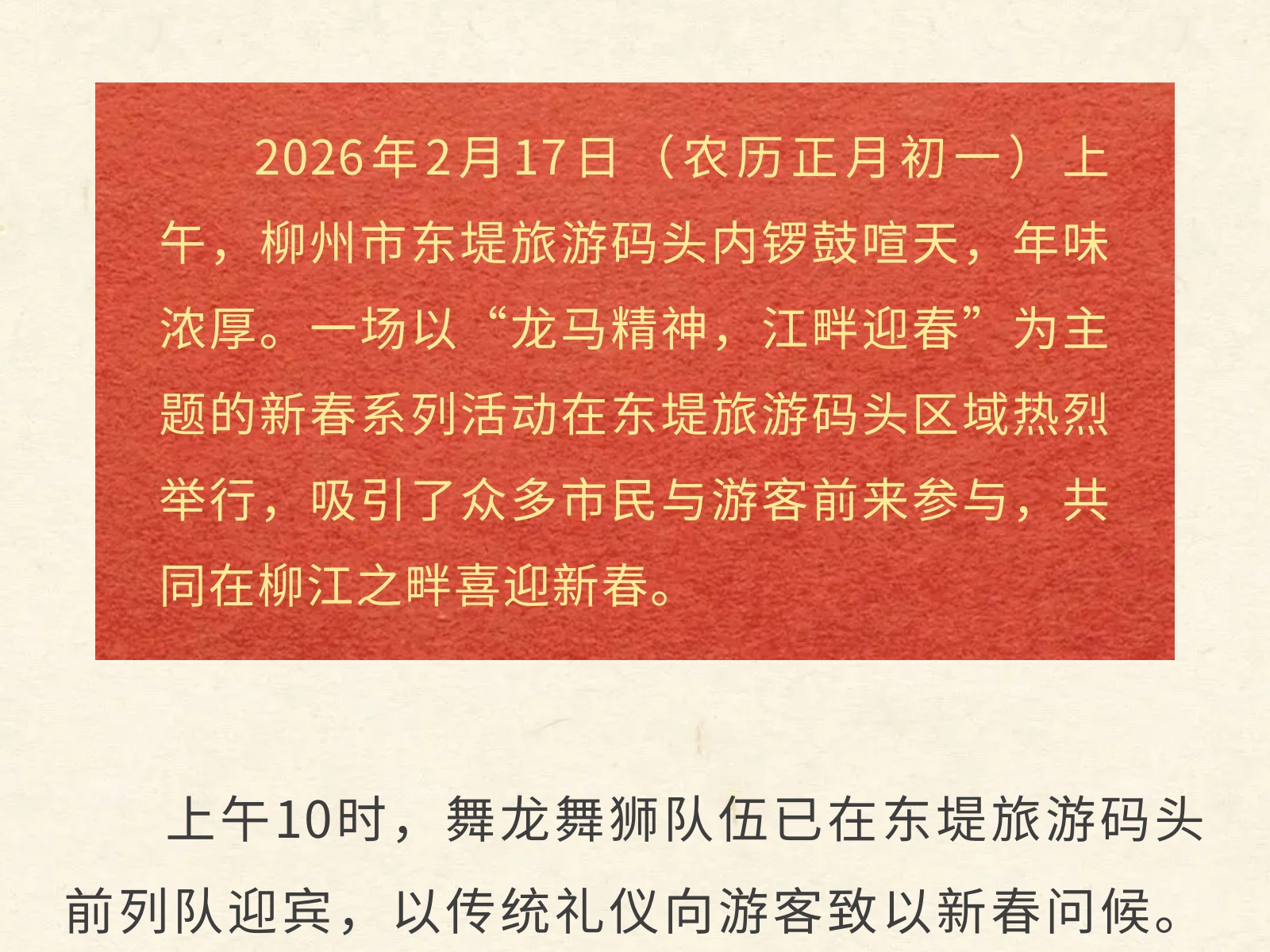 百里柳江景區(qū)“龍馬精神”迎新春,正月初一五船齊發(fā)迎客來(lái) 發(fā)布時(shí)間:2026年02月17日 13時(shí)來(lái)源:本站原創(chuàng)瀏覽:40 人次