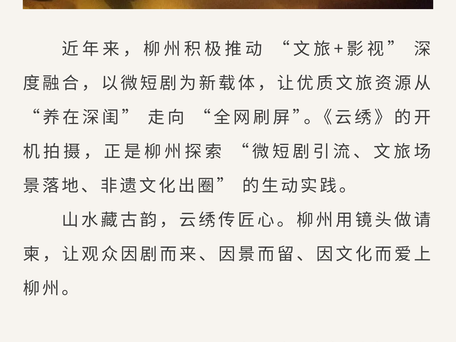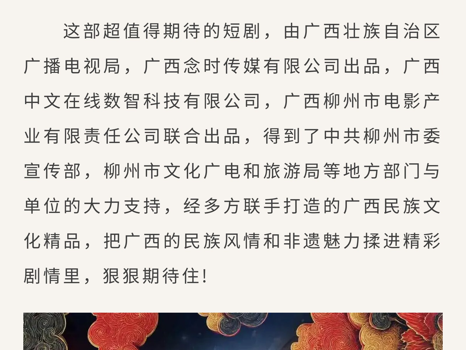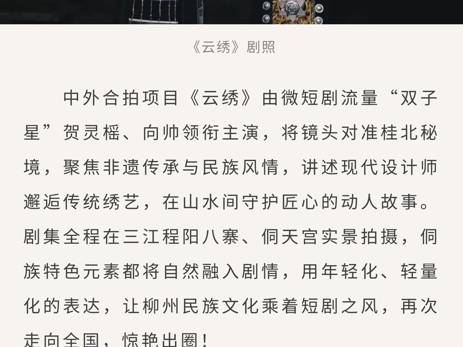 廣西“微短劇+文旅” 重點(diǎn)扶持項(xiàng)目《云繡》開機(jī),把非遺風(fēng)情拍入鏡頭里 發(fā)布時(shí)間:2026年03月06日 10時(shí)來源:本站原創(chuàng)瀏覽:48 人次
