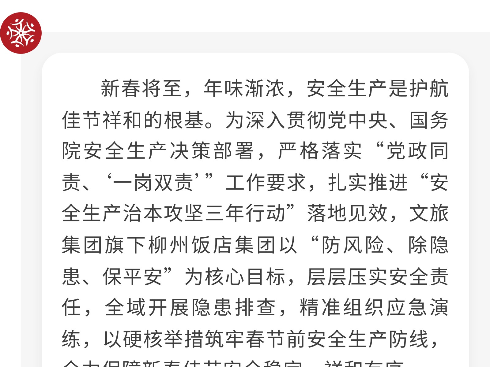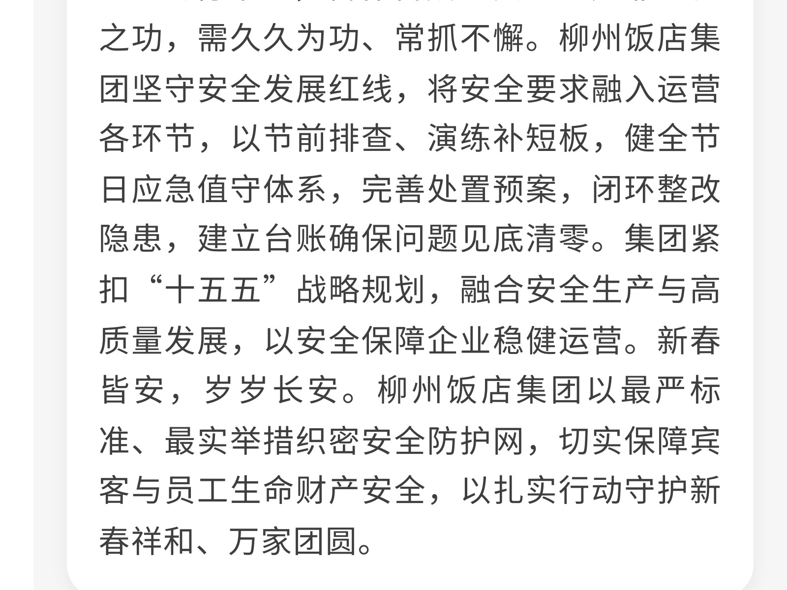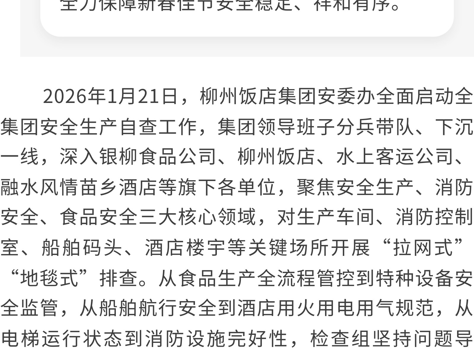 織密安全防護(hù)網(wǎng) 護(hù)航新春平安年——柳州飯店集團(tuán)開展春節(jié)前安全生產(chǎn)系列活動 發(fā)布時間:2026年02月13日 13時來源:本站原創(chuàng)瀏覽:81 人次
