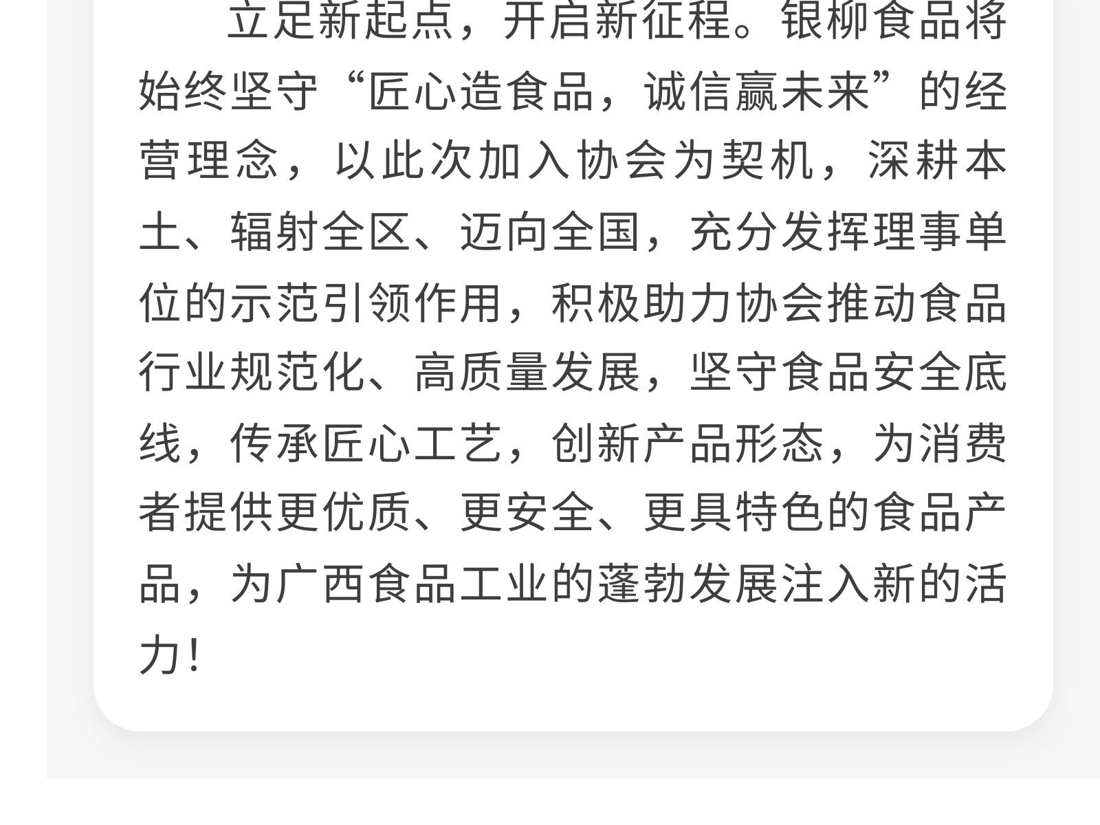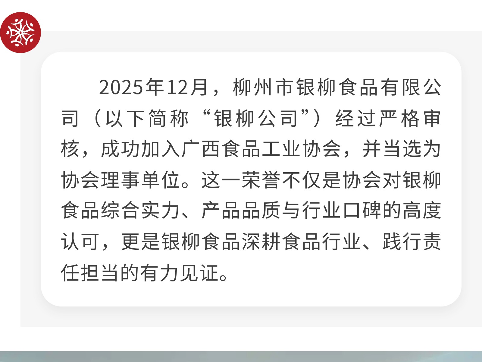 凝心聚力啟新程、勇?lián)姑蛭磥怼菔秀y柳食品有限公司當(dāng)選廣西食品工業(yè)協(xié)會理事單位 發(fā)布時(shí)間:2026年02月25日 15時(shí)來源:本站原創(chuàng)瀏覽:65 人次
